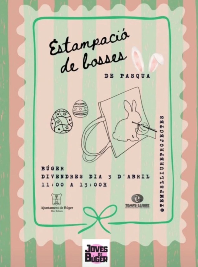 L’activitat està organitzada per Temps Lliure amb la col·laboració de l’Ajuntament de Búger i Joves de Búger, i està pensada perquè els joves passin una estona divertida fent manualitats relacionades amb la Pasqua.